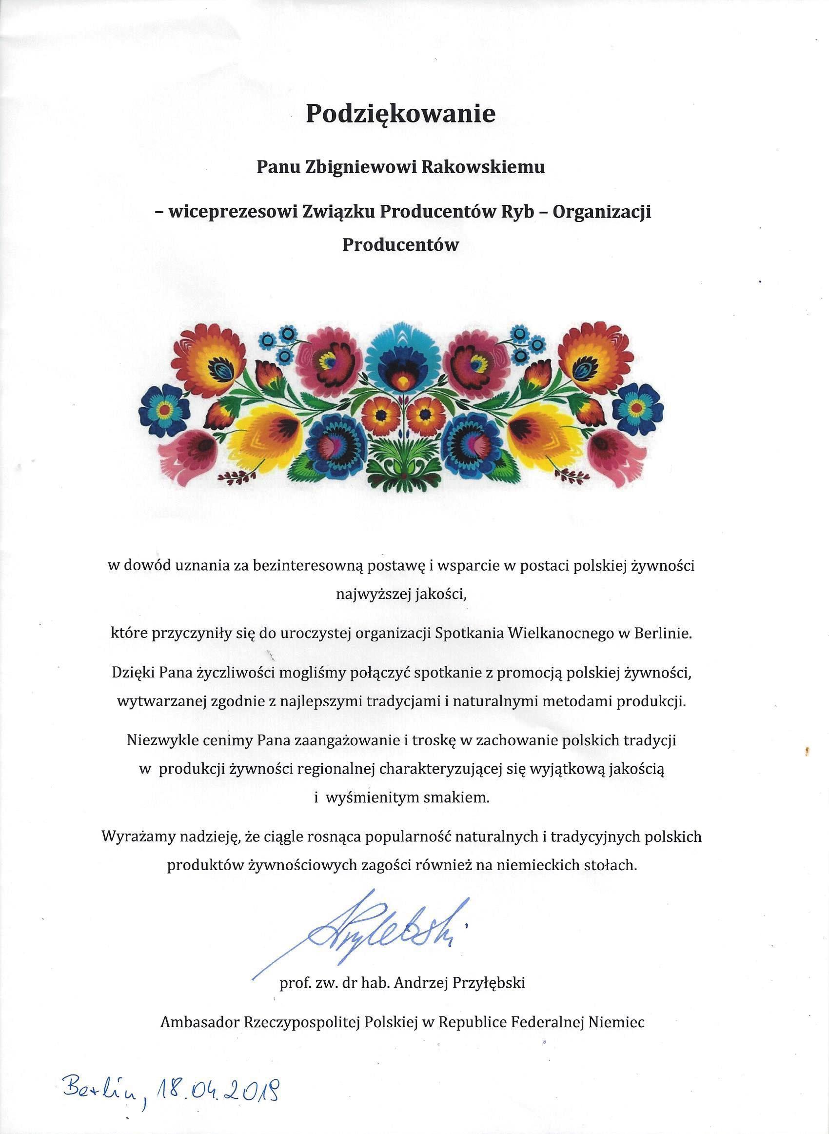 Informujemy, że 18.04.2019 r. Związek Producentów Ryb promował w Berlinie polskie ryby. Koordynacji inicjatywy podjął się Pan Zbigniew Rakowski - Prezes Oddziału Łódzkiego ZPRyb. W podziękowaniu Ambasador RP w Republice Federalnej Niemiec, wręczył podziękowania na ręce Pana Prezesa Zbigniewa Rakowskiego.