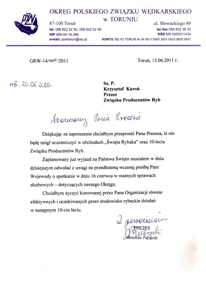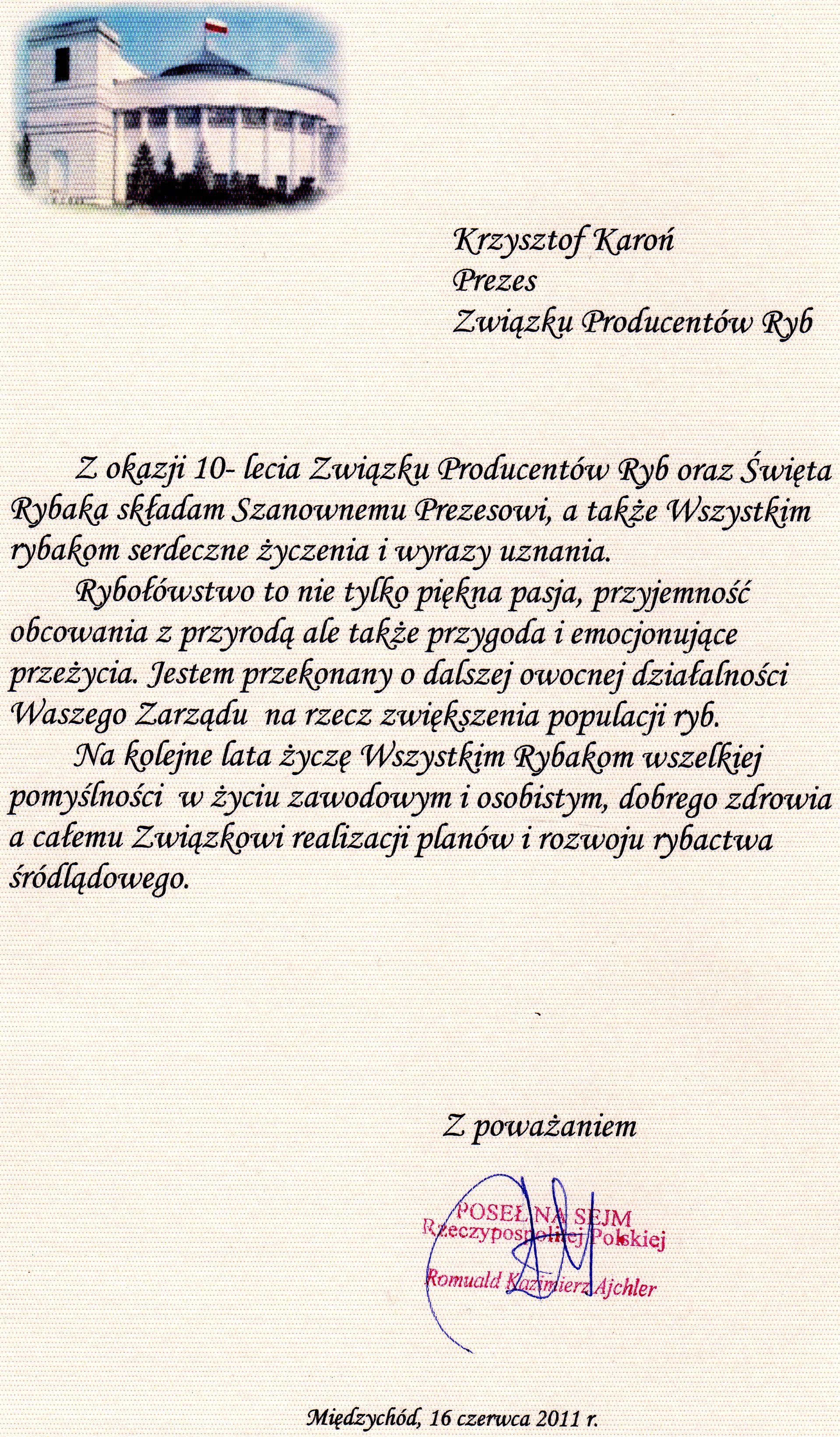 Następnie goście obchodów złożyli gratulacje z okazji 10-lecia ZPRyb, życząc dalszych pomyślnych lat i dalszej równie skutecznej działalności na rzecz rybactwa w Polsce.