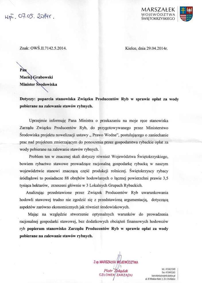 W związku z otrzymaną odpowiedzią z Ministerstwa Środowiska na pismo ZPRyb, wzywające do zaprzestania planowania wprowadzenia opłat za pobór wody na stawy, Zarząd Związku informuje o konieczności podejmowania dalszych interwencji w tej niezwykle istotnej dla rybactwa sprawie.