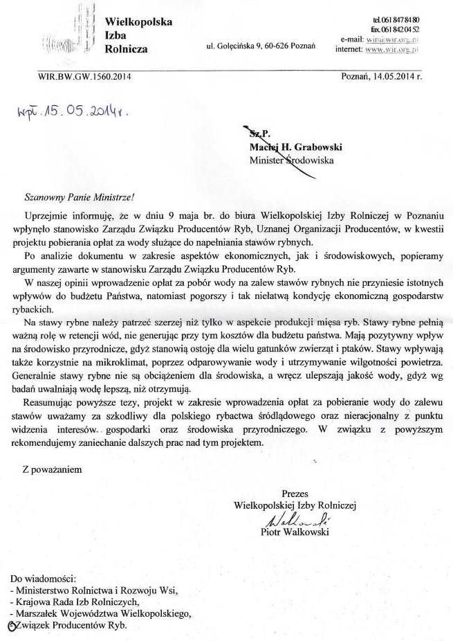 Serdecznie dziękujemy również za wniosek poparcia, jaki Zarząd Związku otrzymał do wiadomości od Prezesa Wielkopolskiej Izby Rolniczej.