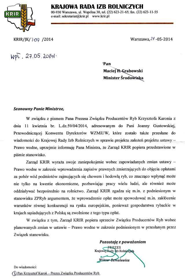 WYSTĄPIENIA ZPRyb: 1. Wystąpienie do Ministra Środowiska>>>>> 2. Zażalenie na bezczynność organu adm.>>>>> 3. Wystąpienie do Premiera Tuska>>>>> 4. Wystąpienia do Marszałków wszystkich Woj.>>>>> 5. Wystąpienie do Konwentu Dyrektorów ZMiUW>>>>> WYSTĄPIENIA ZPRyb POPARLI: 1. Senator S. Karczewski - oświadczenie>>>>> 2. Poseł K. Borkowski - interpelacja>>>>> 3. Krajowa Rada Izb Rolniczych>>>>> 4. Marszałek Woj. Świętokrzyskiego>>>>> 5. Marszałek Woj. Podkarpackiego>>>>> 6. Konwent Dyrektorów ZMiUW>>>>> 7. Mazowiecka Rada Izb Rolniczych>>>>> 8. Wielkopolska Izba Rolnicza>>>>> Artykuł w gazecie "FAKT">>>>>