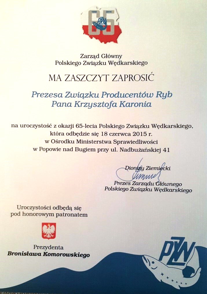 Informujemy, że w br. Polski Związek Wędkarski obchodzi 65-lecie działalności. Patronat nad odbywającymi się w dniu 18 czerwca 2015 r. w Popowie Obchodami objął Prezydent RP. Związek Producentów Ryb podczas uroczystości reprezentował Prezes ZPRyb, Pan Krzysztof Karoń.
