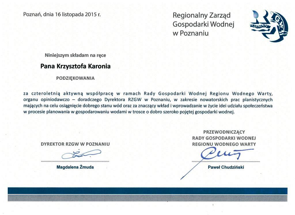 Z uwagi na aktywną współpracę Prezesa ZPRyb - Pana Krzysztofa Karonia w ramach Rady Gospodarki Wodnej Regionu Warty, otrzymał on od Pani Magdaleny Żmudy - Dyrektor RZGW w Poznaniu oraz od Pana Pawła Chudzińskiego - Przewodniczącego Rady, specjalne podziękowania.