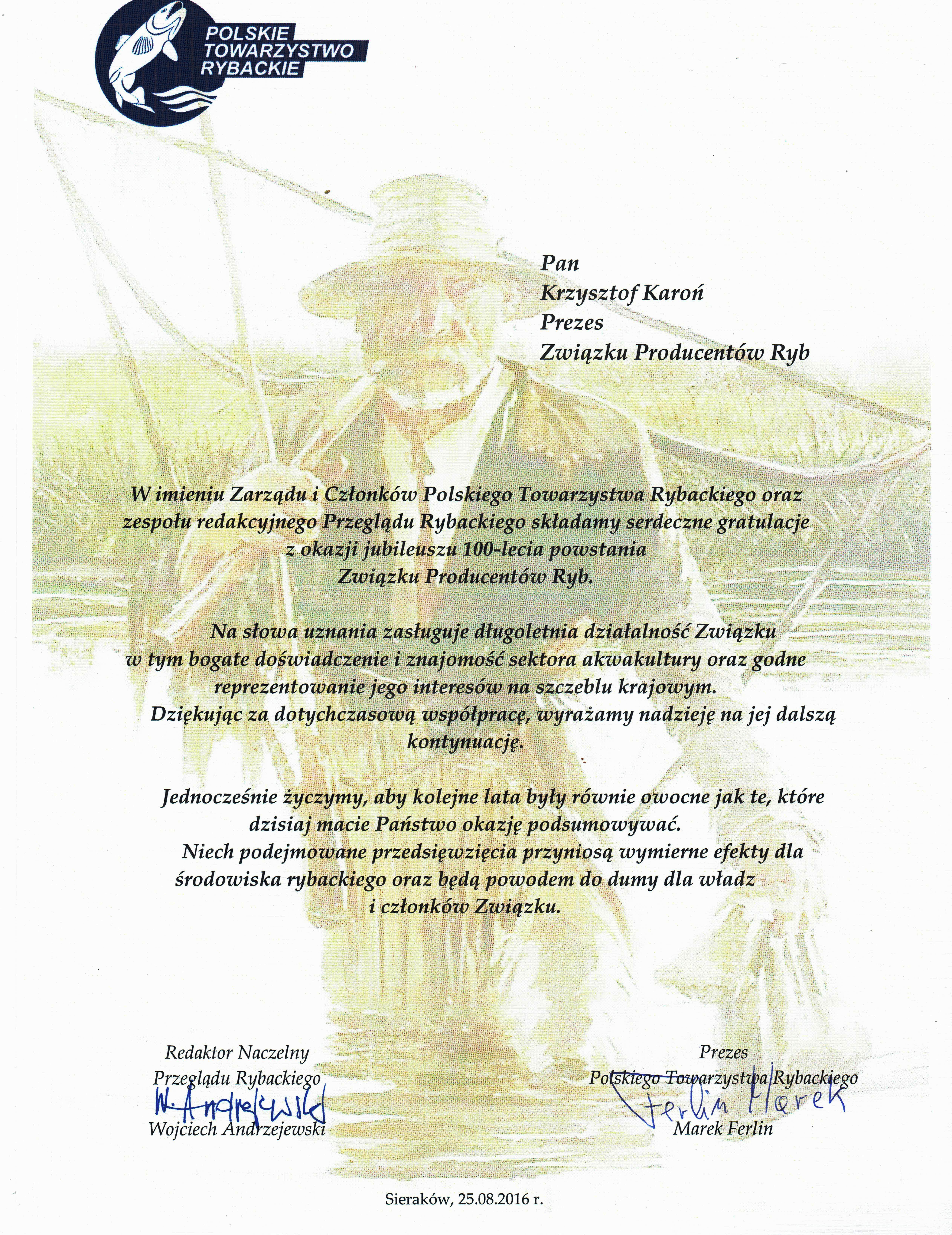 - Marka Ferlina – Prezesa Polskiego Towarzystwa Rybackiego,