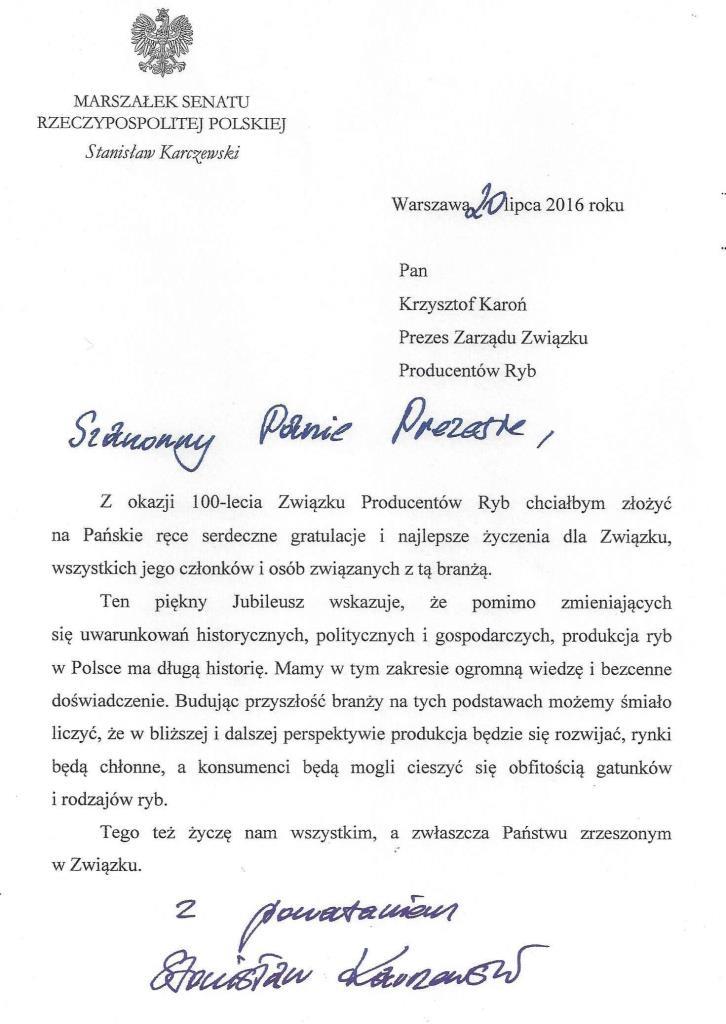 Prowadzący część oficjalną Lech Staniszewski, odczytał laudację skierowaną do ZPRyb przez Marszałka Senatu, Stanisława Karczewskiego.