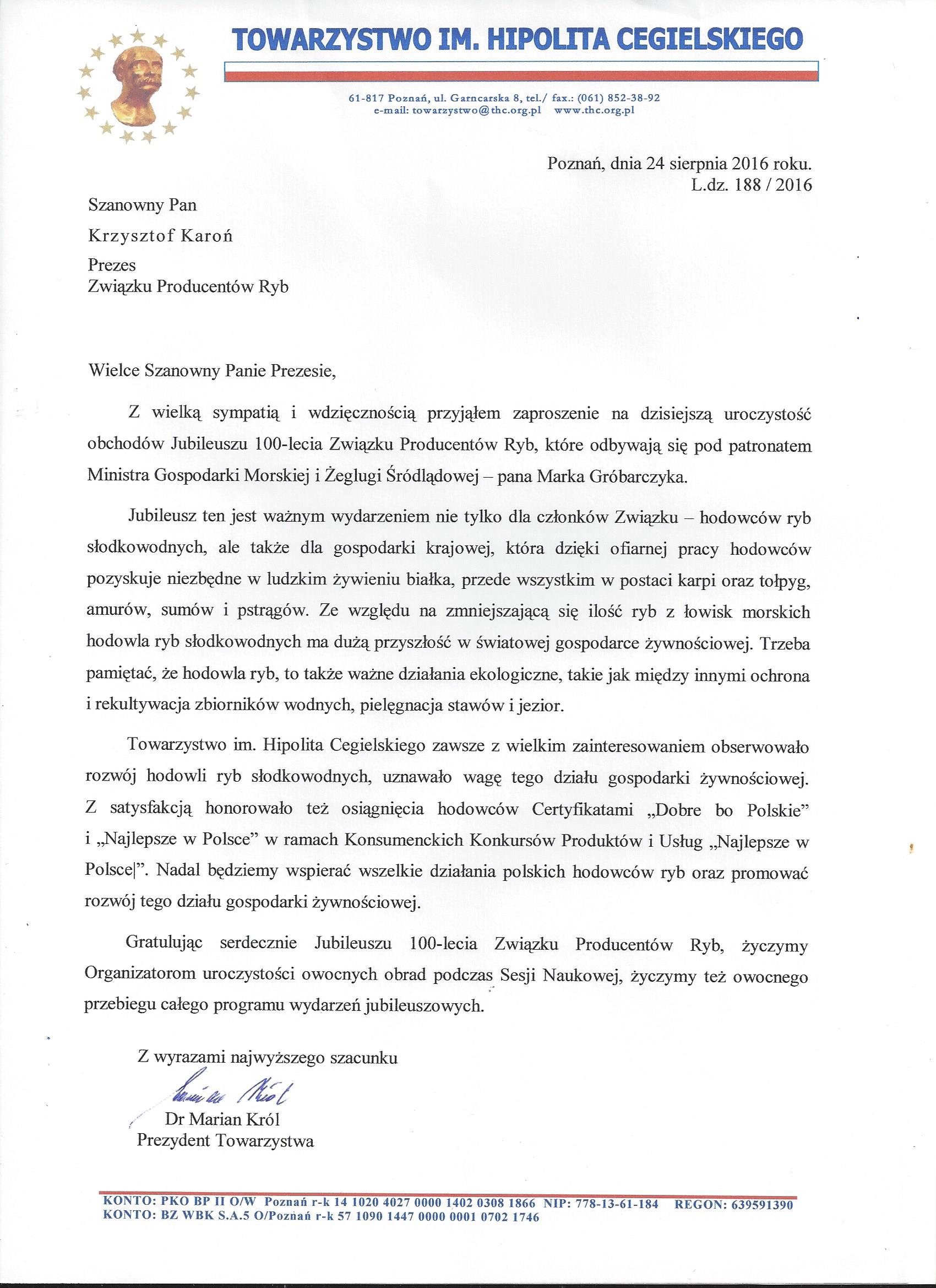 - dr Mariana Króla – Prezydenta Towarzystwa im. Hipolita Cegielskiego w Poznaniu, jedynego członka honorowego ZPRyb