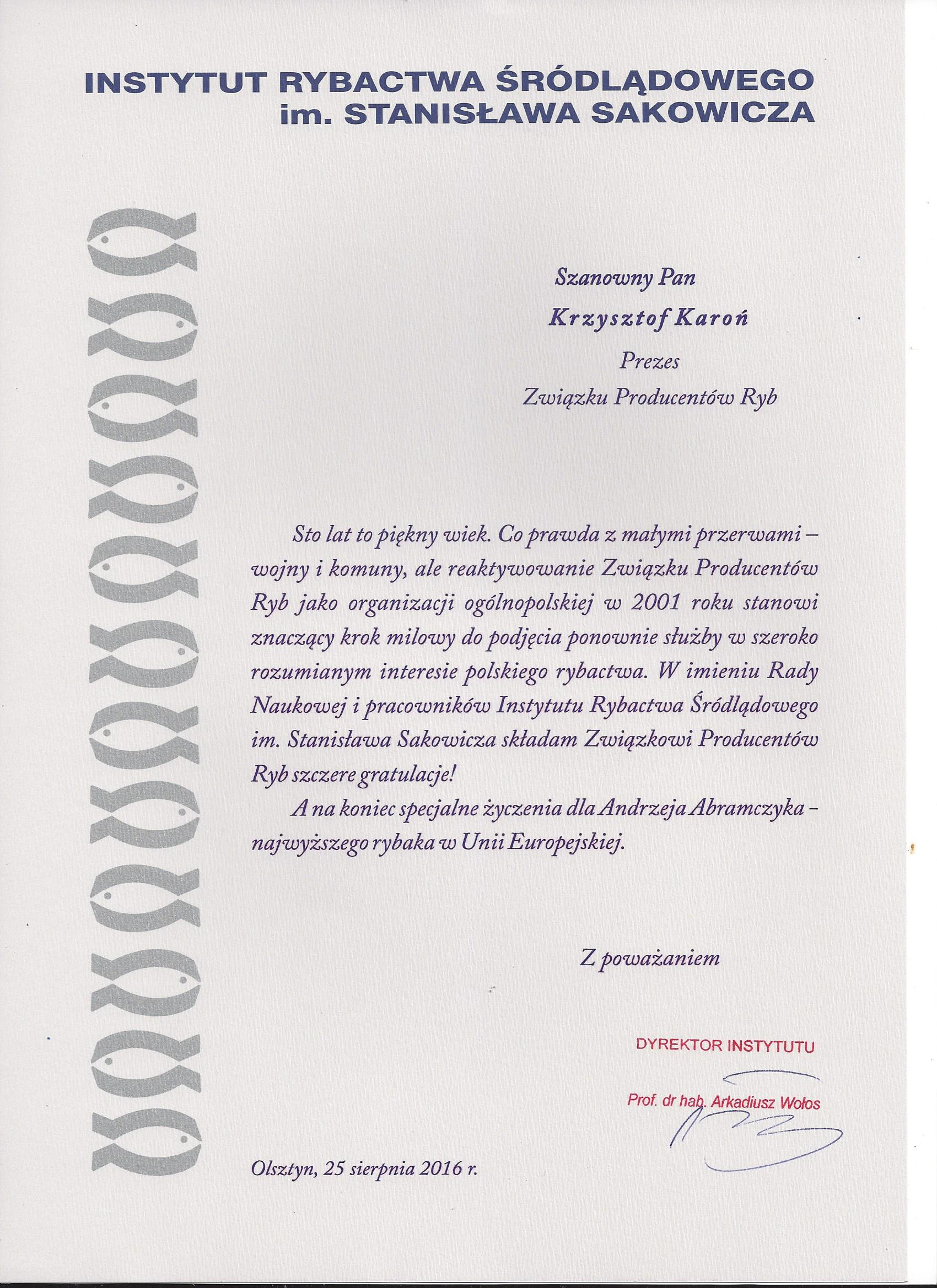 - prof. dr hab. Arkadiusz Wołos – Dyrektor Instytutu Rybactwa Śródlądowego w Olsztynie,