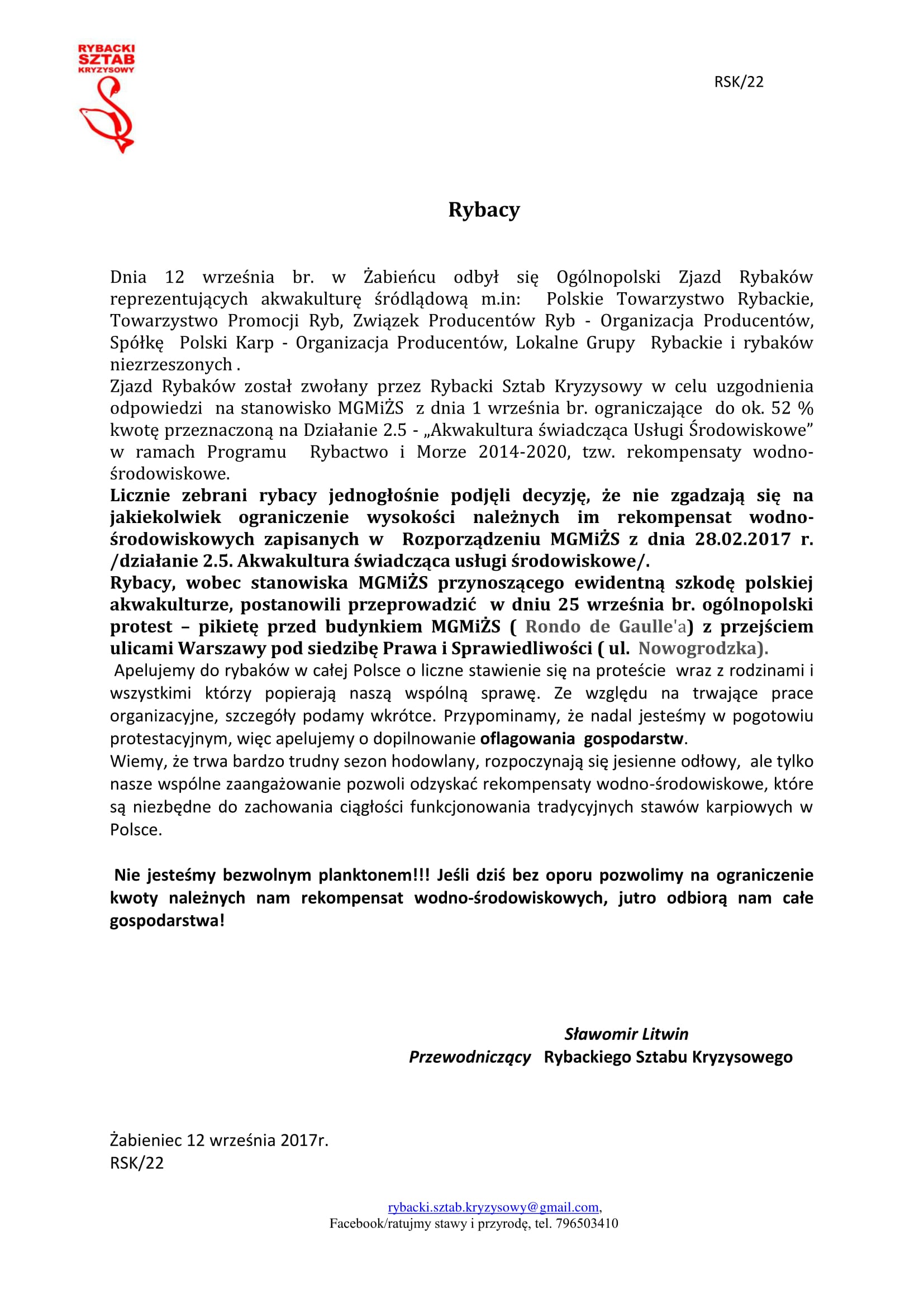 W dniu 25 września 2017 r. Rybacki Sztab Kryzysowy, w związku z propozycją nowego podziału środków dla Działania 2.5, przedstawioną na spotkaniu w dniu 1 września br., która zakłada przeznaczenie dla Działania 2.5 zaledwie 55% środków przewidzianych w rozporządzeniu, organizuje protest-piketę przed Gmachem MGMiŻŚ.