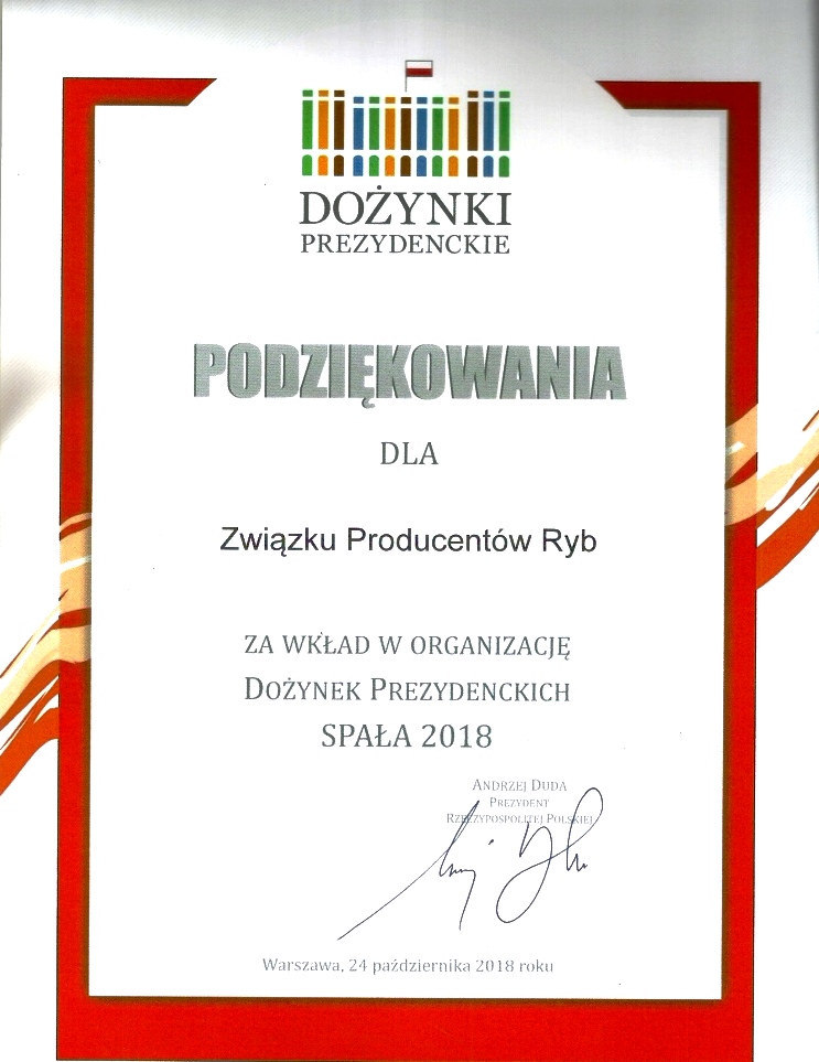 Związek Producentów Ryb, za swój wkład w organizację Dożynek, otrzymał od Pana Prezydenta dyplom z podziękowaniami.